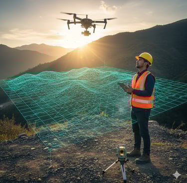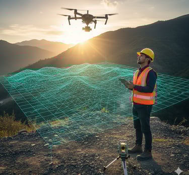 Topografía de Alta Definición: Capturamos la geometría del terreno con drones (Fotogrametría Aérea) y equipos GNSS, generando Modelos Digitales del Terreno (MDT).
